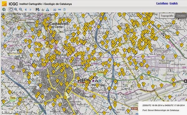 Malgrat tot, les tempestes van ser irregulars ja que mentre Reus queia una forta tempesta al Baix Penedès una pedregada a Tarragona no va caure ni una sola gota, a continuació podeu veure el mapa de llamps caiguts a Catalunya, on en territori català van caure 2.977 llamps de núvol a terra: