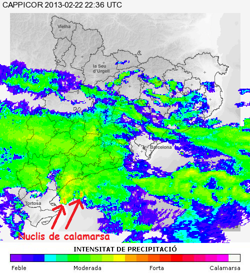 Podem veure com s'anava configurant la situació divendres a la nit i com s'inicia l'entrada d'aire molt fred per Girona i Barcelona, alhora que començava a precipitar a Tarragona, fins i tot amb alguns nuclis de calamarsa davant la costa daurada, degut a la forta inestabilitat: